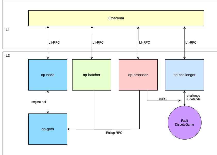4. Disputes over state transitions are resolved by the **op-challenger**, ensuring the validity of the chain.
