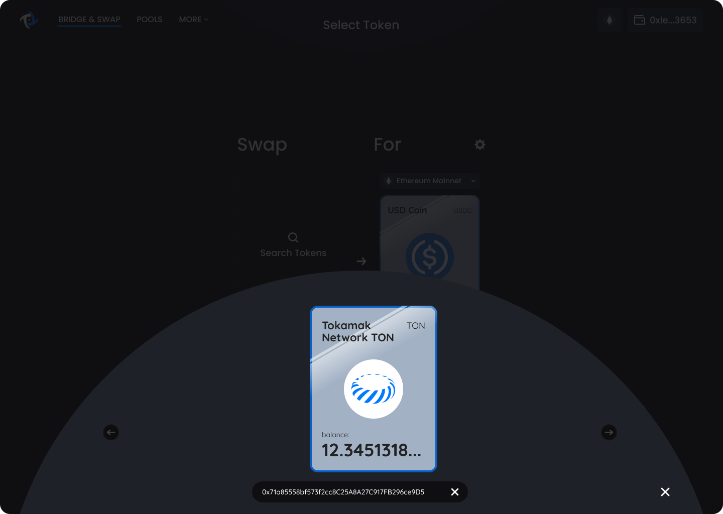 <figure><img src="https://3565366697-files.gitbook.io/~/files/v0/b/gitbook-x-prod.appspot.com/o/spaces%2Fl0dwiwSNGrEYCAvrI0ht%2Fuploads%2Fq74tOgi8Ppd2xyCX0uhW%2F17.png?alt=media&#x26;token=4e16379a-8e7a-4a2b-8621-196027c510b5" alt=""><figcaption><p>Select the token to be used in Tokamak Bridge</p></figcaption></figure>